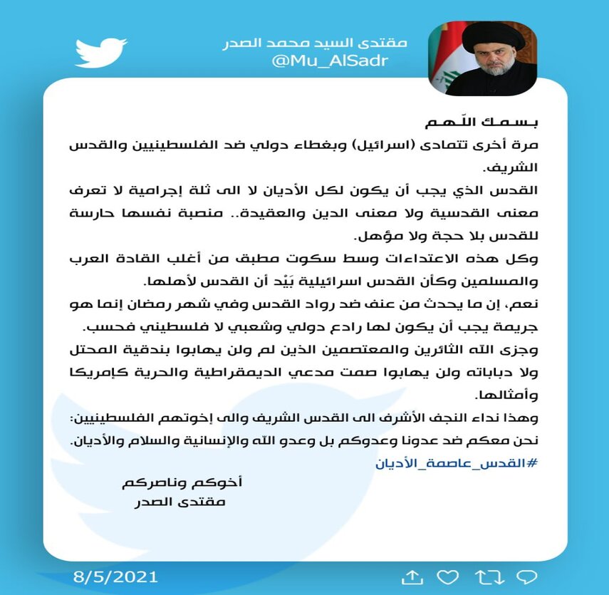 وكتب الصدر في تغريدة على تويتر، اليوم (8 ايار 2021)، ان النجف تقف مع فلسطين ضد عدوكم بل وعدو الله والاسلام والاديان.