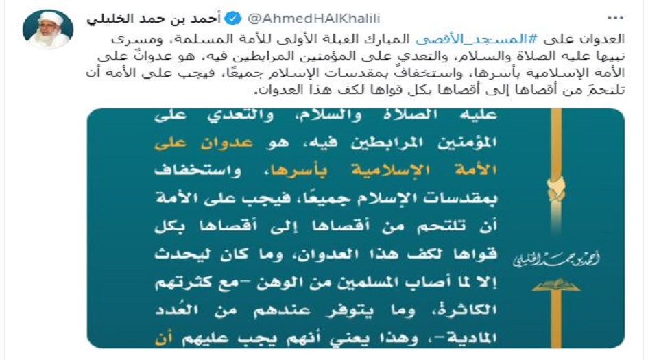 وقال "الخليلي" في سلسلة تغريدات له على تويتر: "إن حماية القدس ومقدساتها بما فيها المسجد الأقصى واجب على الأمة العربية والإسلامية".