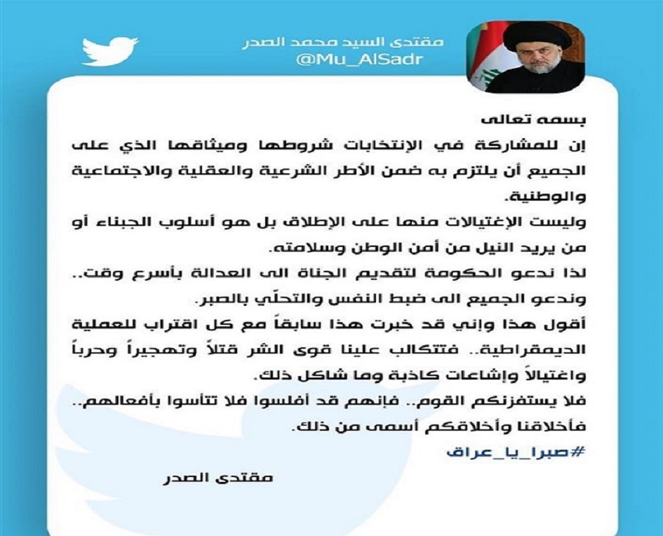 ودعا الصدر في تغريدة له على "تويتر"، الجميع الى ضبط النفس.