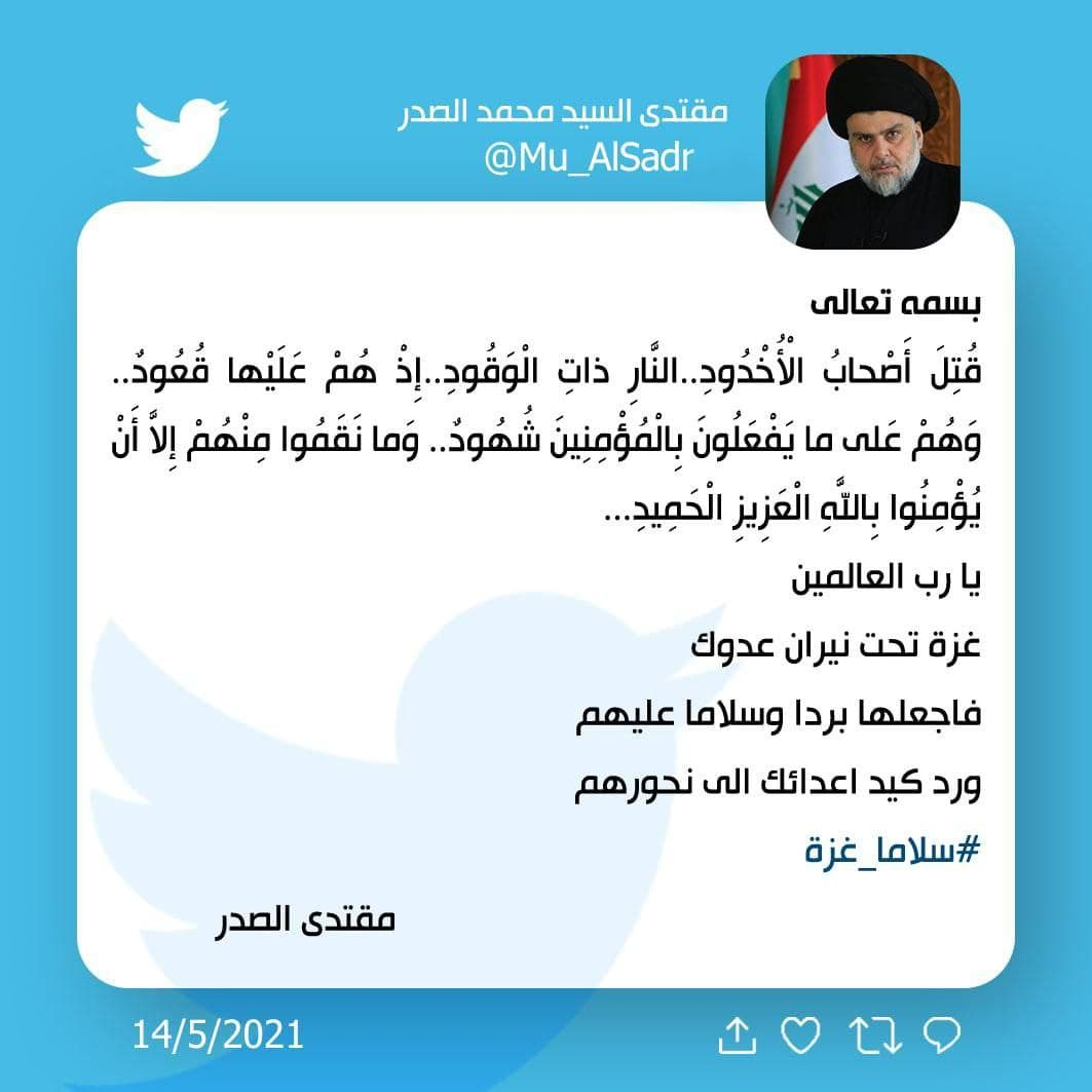 غرد زعيم التيار الصدري مقتدى الصدر، فجر الجمعة، مجدداً، بشأن الأوضاع الجارية في الأراضي الفلسطينية.