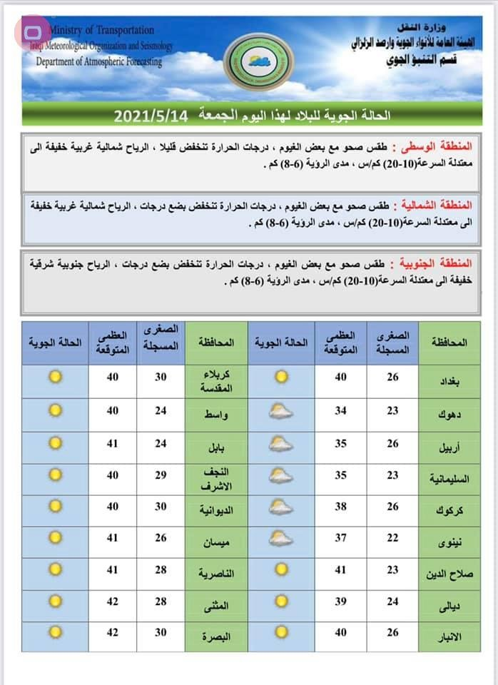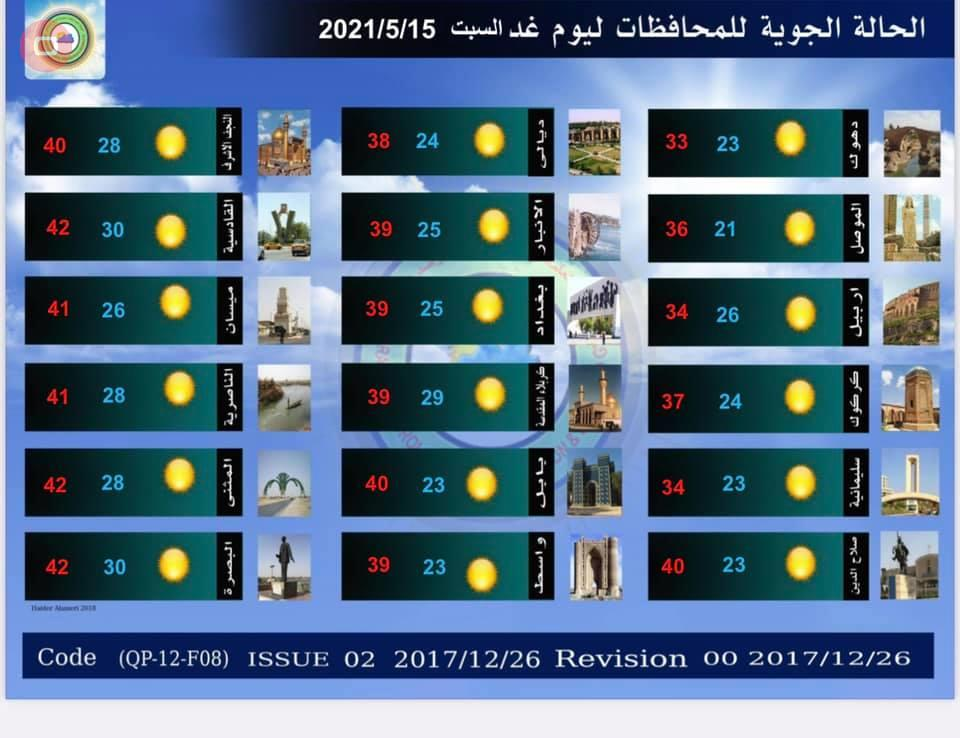 وذكرت الهيئة في تقريرها اليومي والذي تابعته السومرية نيوز، ان "طقس يوم غد السبت، سيكون في عموم مناطق البلاد، صحواً مع قطع من الغيوم، ودرجات الحرارة العظمى في العاصمة بغداد ستسجل 39 درجة مئوية".