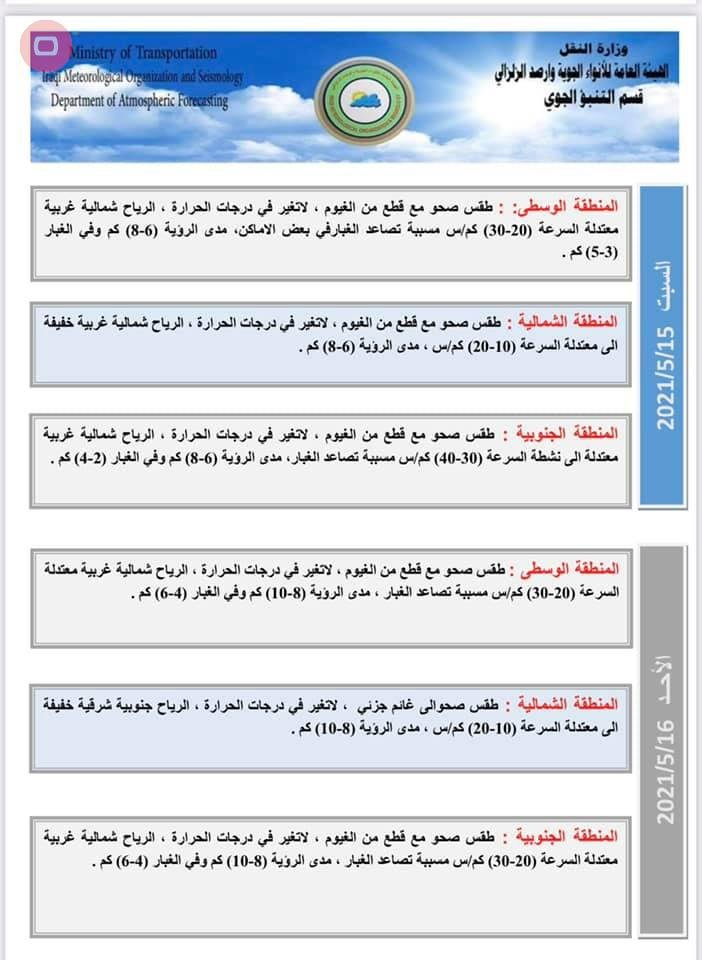 واشارت الى ان "طقس الأحد، سيكون في الوسط والجنوب، صحواً مع قطع من الغيوم، وفي المنطقة الشمالية سيكون صحواً الى غائم جزئياً، ولا تغير في درجات الحرارة عن اليوم السابق بعموم مناطق البلاد".