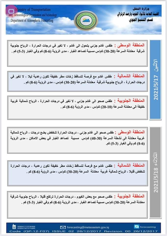 واضافت ان "طقس الأثنين المقبل سيكون في المنطقة الوسطى، غائما جزئياً يتحول الى غائم، وفي الشمالية، غائماً مع فرصة لتساقط زخات مطر خفيفة تكون رعدية ليلاً، وفي المنطقة الجنوبية، صحوا الى غائم جزئيا، ولا تغير في درجات الحرارة بعموم المناطق".