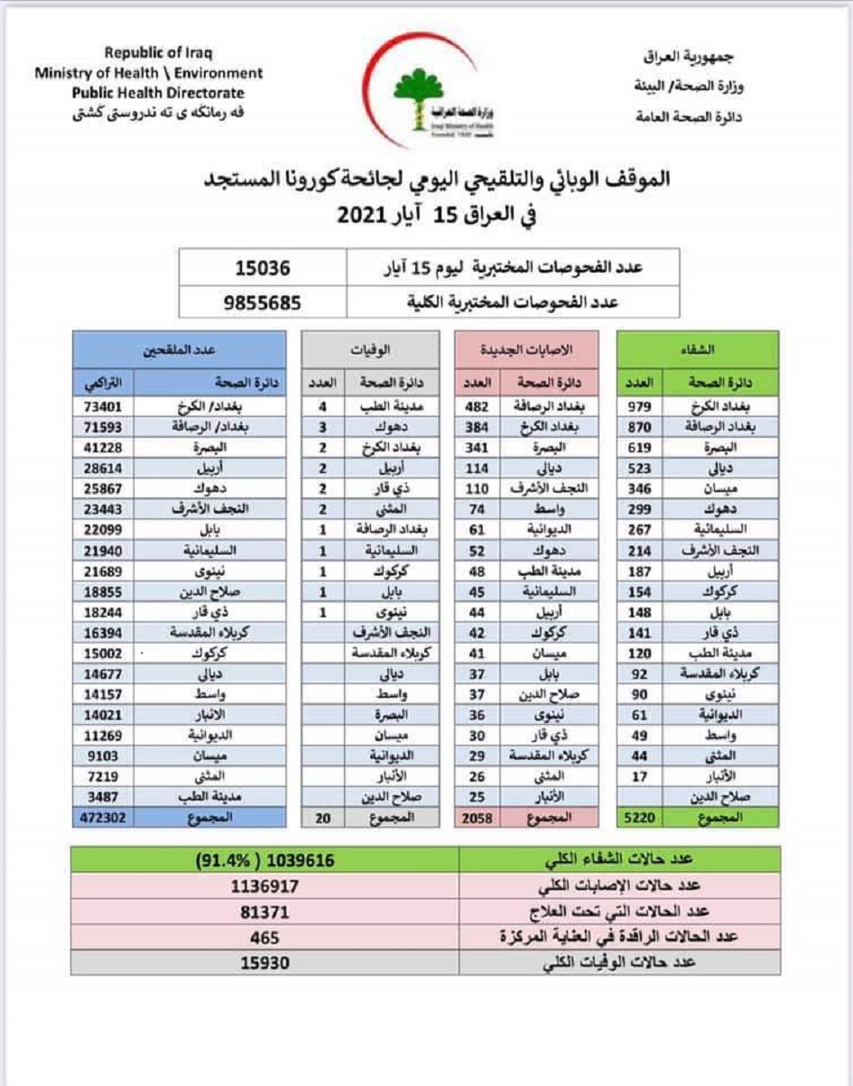 ويظهر في الجدول تسجيل ٢٠٥٨ إصابة جديدة و٢٠ حالة وفاة و٥٢٢٠ حالة شفاء وكان عدد الملقحين الكلي ٤٧٢٣٠٢.