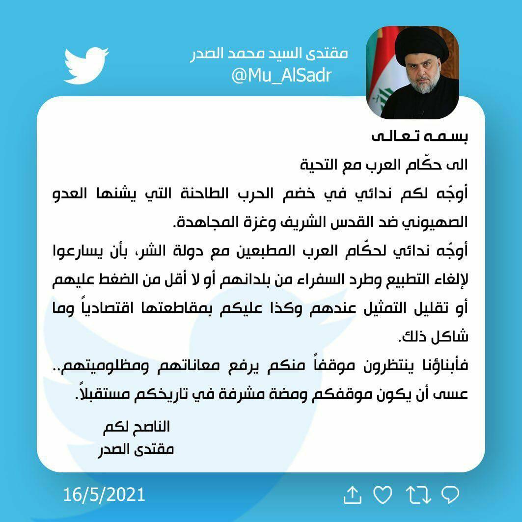 وقال الصدر في تغريدة له عبر تويتر (16 أيار 2021)، "اوجه لكم ندائي في خضم الحرب الطاحنة التي يشنها العدو الصهيوني ضد القدس الشريف وغزة المجاهدة".