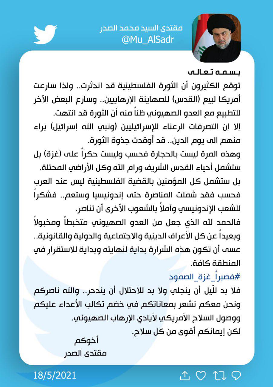 وكتب الصدر في تغريدة على تويتر، اليوم (18 ايار 2021)، انه "توقع الكثيرون ان الثورة الفلسطينية قد اندثرت.. ولهذا سارعت امريكا لبيع (القدس) للصهاينة الارهابيين.. وسارع البعض الاخر للتطبيع مع العدو الصهيوني ظنا منه ان الثورة قد انتهت".