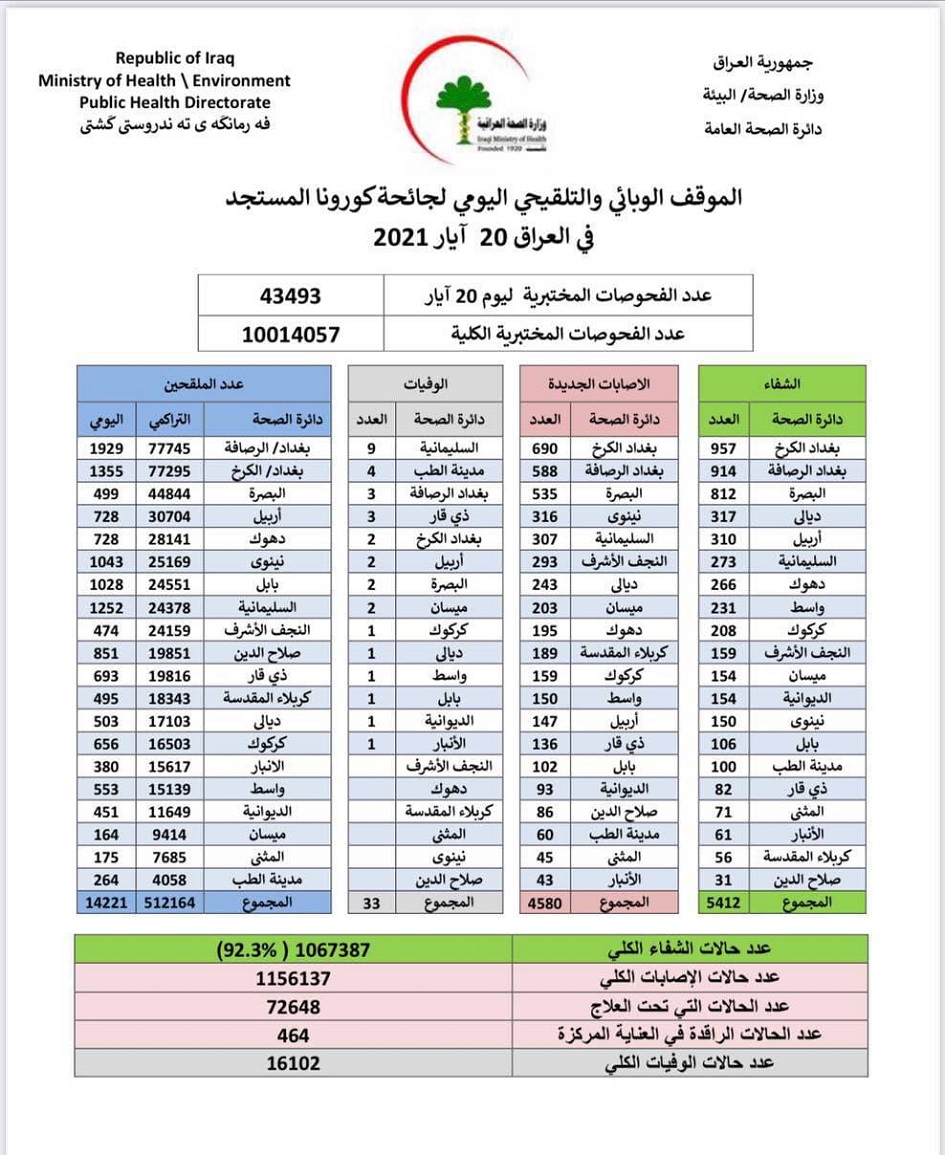 وبحسب الموقف الوبائي للوزارة خلال الـ 24 ساعة الماضية فانها سجلت 4580 إصابة جديدة و5412 حالة شفاء.