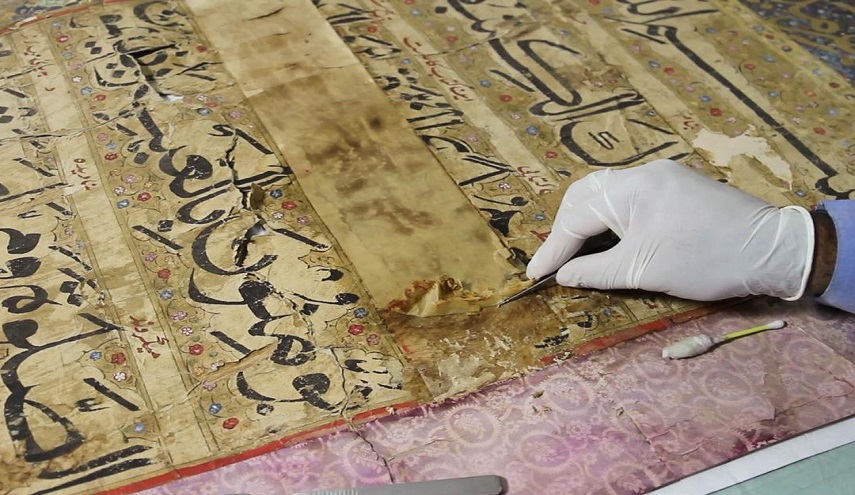 وأردف مبیناً أن فریق الترمیم التابع إلی مرکز "نور" الدولي للمیکروفیلم لم سیتخدم أي مادة کیمیاویة في ترمیم المصحف بل إستخدم مواد طبیعیة وذلك من أجل تقویمه وإبقاءه لمدة أطول.