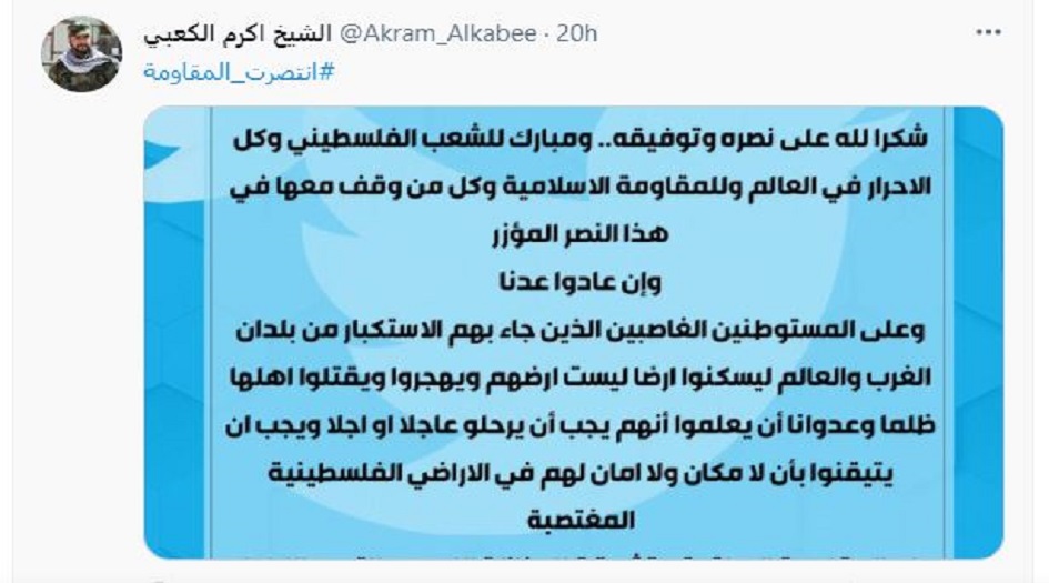 واستشهد الشيخ أكرم الكعبي بالاية الكريمة "ان تنصروا الله ینصرکم ویثبت اقدامکم"، وكتب: شكرا لله على نصره وتوفيقه، ومبارك للشعب الفلسطيني وكل الاحرار في العالم وللمقاومة الإسلامية وكل من وقف معها.