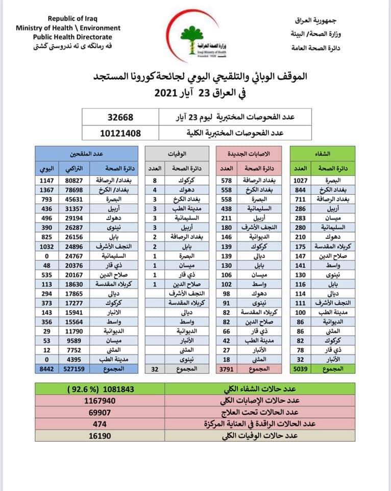 وقالت الوزارة في بيان ، إنها "سجلت 3791 حالة إصابة جديدة، و 5039 حالة شفاء، و 32 حالة وفاة بالفيروس". وأشارت إلى "تلقي 8442 شخصاً للقاح كورونا خلال الـ24 ساعة الماضية"