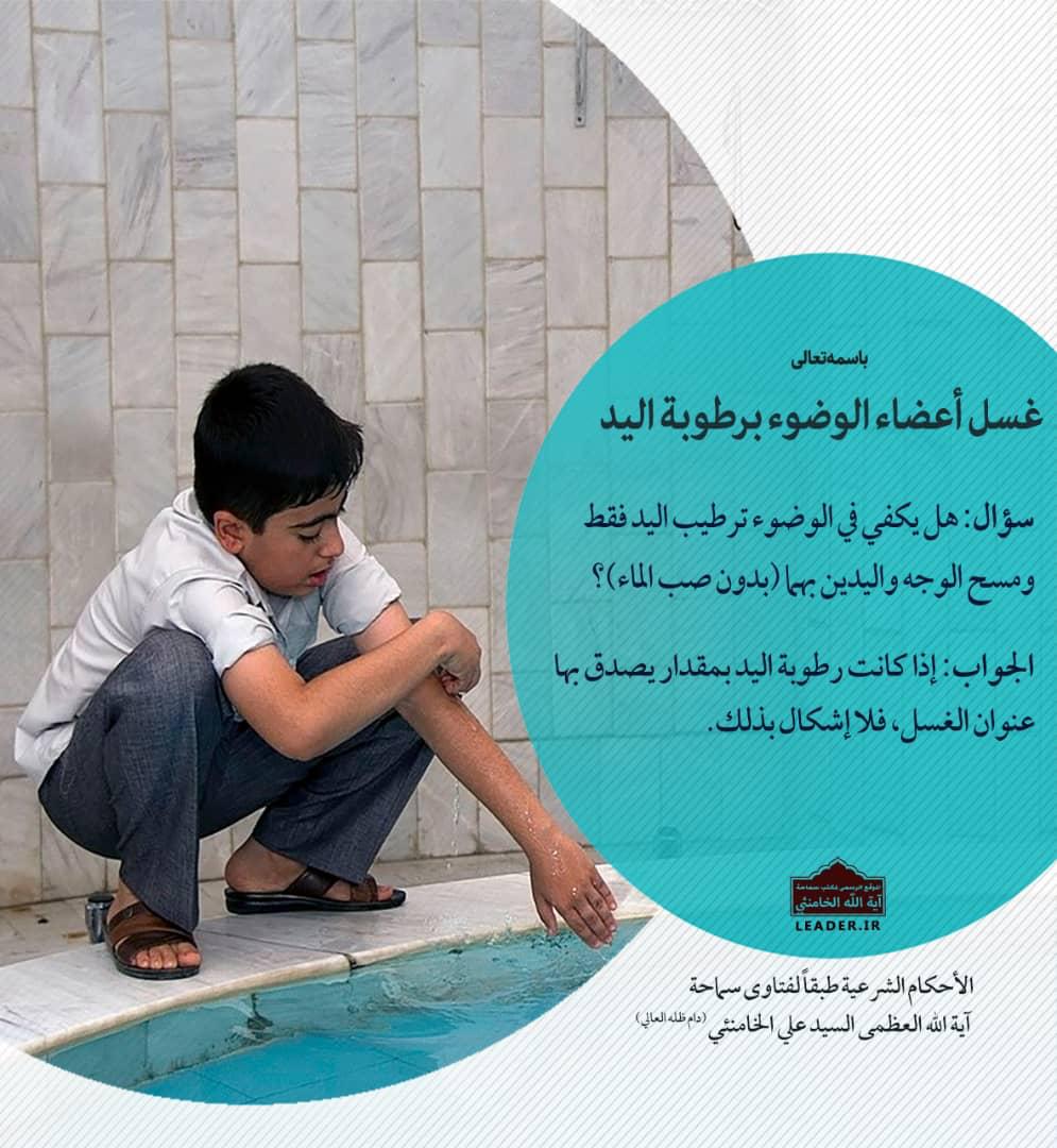 السؤال: هل يكفي في الوضوء ترطيب اليد فقط ومسح الوجه واليدين بهما {بدون صب الماء}؟ الجواب: إذا كانت رطوبة اليد بمقدار يصدق بها عنوان الغسل، فلا اشكال بذلك.