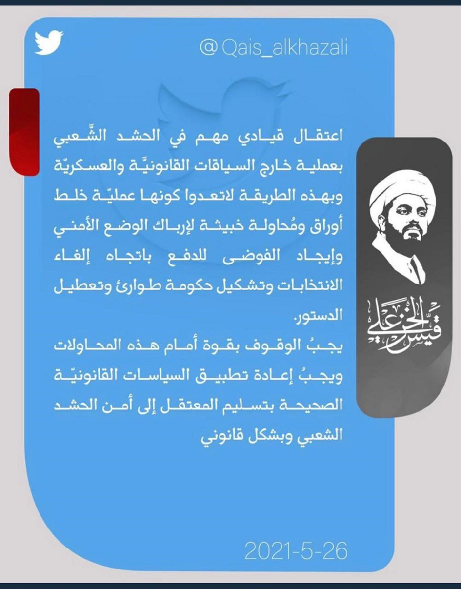 وقال الخزعلي في تغريدة له عبر تويتر، "يجب الوقوف بقوة امام هذه المحاولات ويجب اعادة تطبيق السياسات القانونية الصحيحة بتسليم المعتقل الى امن الحشد الشعبي وبشكل قانوني".
