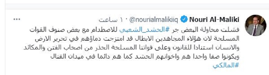 وقال المالكي في تغريدة له على تويتر انه "فشلت محاولة البعض جر الحشد الشعبي للاصطدام مع بعض صنوف القوات المسلحة لان هؤلاء المجاهدين الابطال قد امتزجت دماؤهم في تحرير الارض والانسان استنادا للقانون".