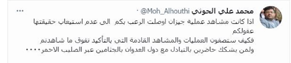 وقال عضو المجلس السياسي الأعلى في الحركة، محمد علي الحوثي في تغريدة عبر "تويتر" مخاطبا تحالف العدوان السعودي : "إذا كانت مشاهد عملية جيزان أوصلت الرعب بكم إلى عدم استيعاب حقيقتها، فكيف ستصفون العمليات والمشاهد القادمة".
