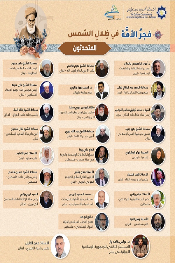 كما يتحدث في هذا الاحتفال، مستشار مركز الأهرام للدراسات السياسية والاستراتيجية الدكتور محمد السعيد إدريس، وأمين عام حركة التوحيد الإسلامي سماحة الشيخ بلال شعبان، ورئيس تحرير جريدة البناء الأستاذ ناصر قنديل، ورئيس مجلس علماء فلسطين سماحة الشيخ حسين قاسم، وعضو المكتب السياسي لحركة الجهاد الإسلامي في فلسطين الدكتور أنور أبو طه، وأمين عام رابطة الشغيلة الأستاذ زاهر الخطيب، والإعلامية التونسية كوثر البشراوي، وأمين عام حركة الأمة سماحة الشيخ عبد الله جبري، والكاتب الأردني الأستاذ زهير العزة، ورئيس هيئة الإغاثة للعلماء المسلمين الجزائريين كريم رزقي، ورئيس بلدية الغبيري الأستاذ معن الخليل، يُفتتح الحفل بكلمة للمستشار الثقافي للجمهورية الإسلامية الإيرانية في لبنان الدكتور عباس خامه يار.
