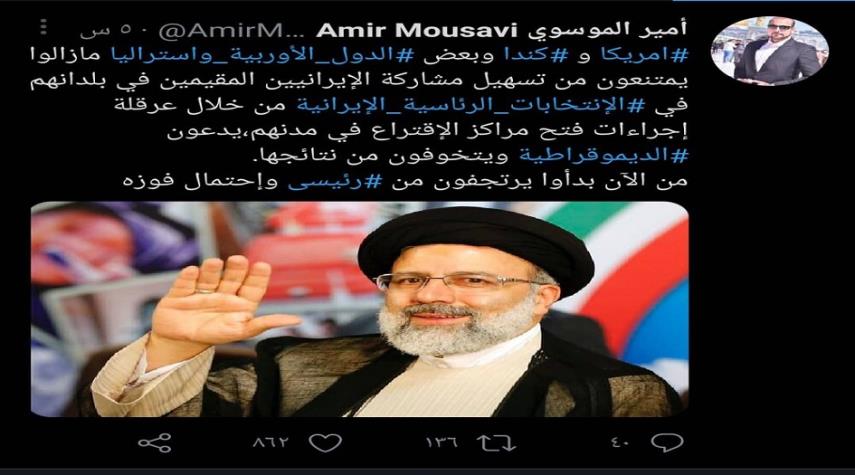 مدير مركز الدراسات الإستراتيجية والعلاقات الدولية بطهران "أمير الموسوي" في تغريدة له على "تويتر": "امريكا و كندا وبعض الدول الأوربية واستراليا مازالوا يمتنعون من تسهيل مشاركة الإيرانيين المقيمين في بلدانهم في الإنتخابات الرئاسية الإيرانية، من خلال عرقلة إجراءات فتح مراكز الإقتراع في مدنهم.