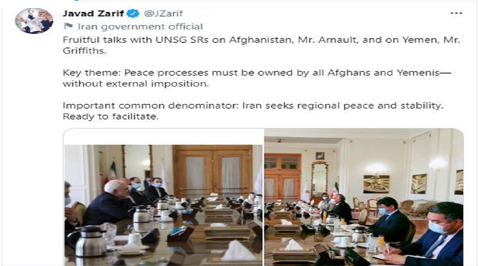 واضاف ظريف : لقد أجرينا محادثات مثمرة مع مبعوثي الأمم المتحدة الى افغانستان واليمن جان أرنو ومارتن غريفيث .