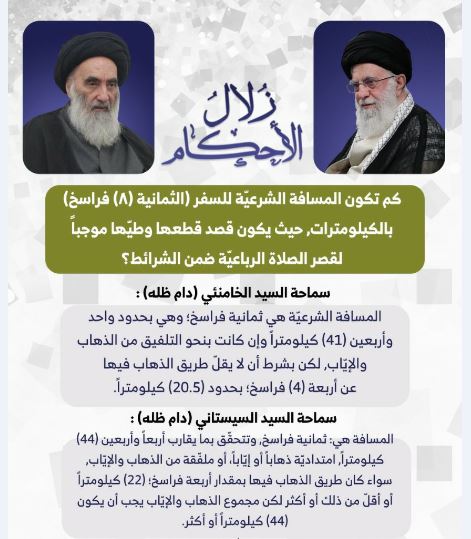 المسافة الشرعية هي سمانية فراسخ ، وهي بحد واحد وأربعين {41} كيلومترا وإن كانت بنحو التلفيق من الذهاب والإياب لكن بشرط أن لايقل طريق الذهاب فيها عن أربعة {4} فراسخ بحدود {5.20} كيلومترا.