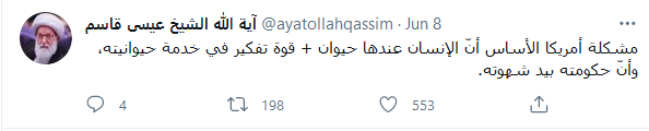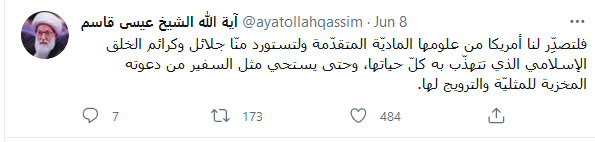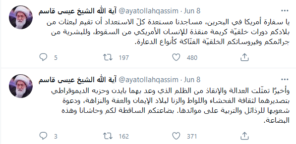 وخاطب سماحته عبر موقع التواصل الاجتماعي تويتر، سفارة الولايات المتحدة في المنامة، بقوله: “يا سفارة أمريكا في البحرين، مساجدنا مستعدة كل الاستعداد أن تقيم البعثات من بلادكم دورات تدريبية خلقية كريمة منقذة للإنسان الأمريكي من السقوط، وللبشرية من جرائمكم وفيروساتكم الخلقية الفتّاكة كأنواع الدعارة”.