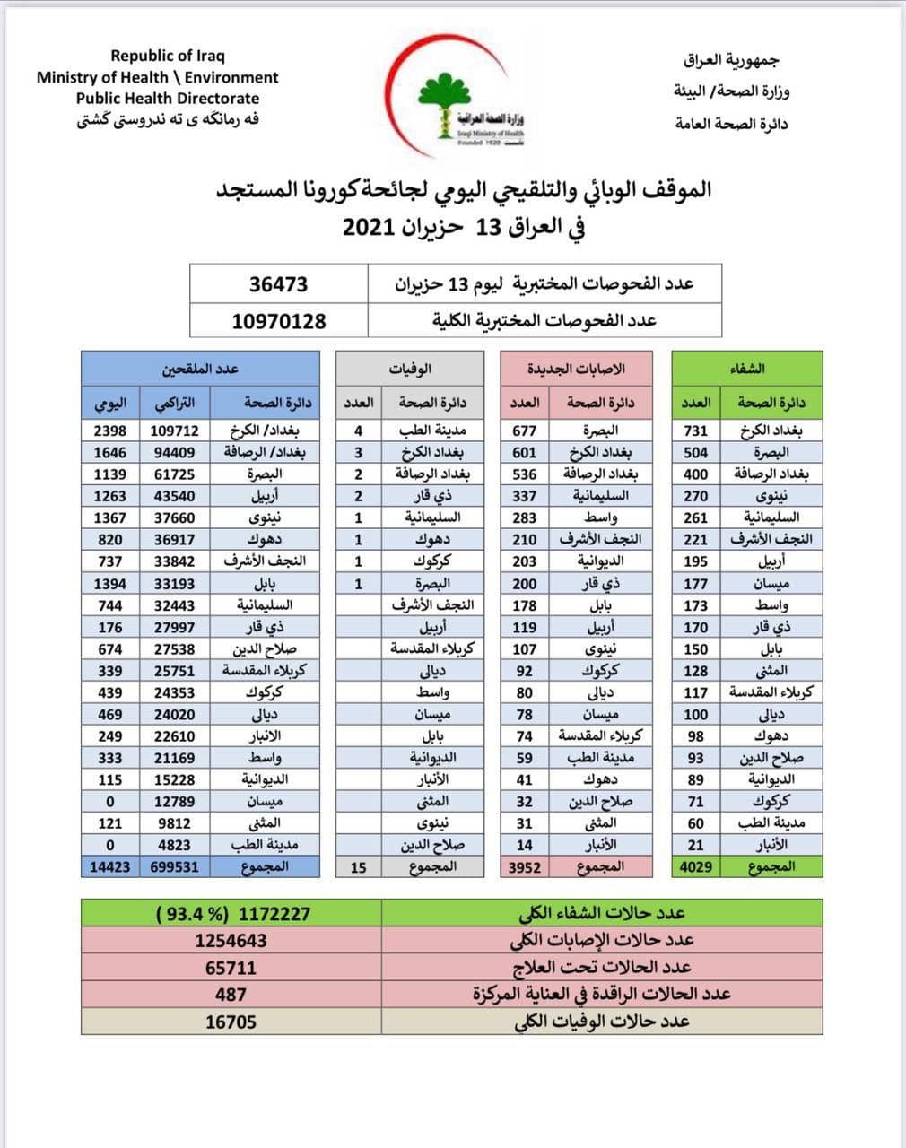 وقالت الوزارة في بيان إنها "سجلت 3952 حالة إصابة جديدة، مقابل تماثل 4029 حالة للشفاء، و 15 حالة وفاة بالفيروس". وأشارت إلى "تلقي 14423 شخصاً للقاح كورونا في يوم واحد".