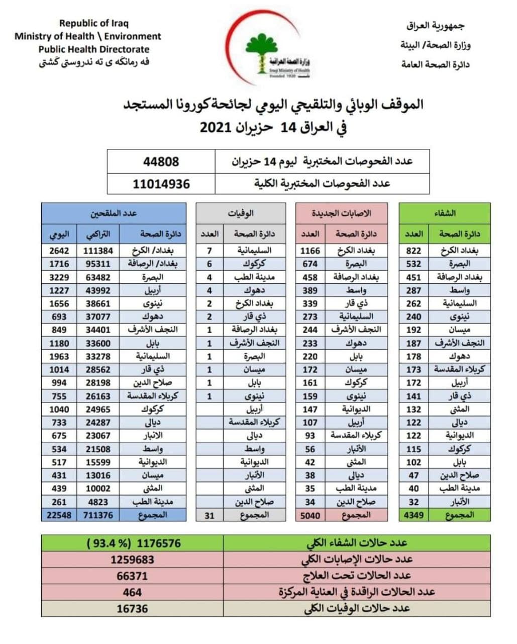 وقالت الوزارة في بيان، إن "كوادرها سجلت 5040 إصابة جديدة، و 4349 حالة شفاء، و31 وفاة بالفيروس". وأشارت إلى "تلقي 22548 شخصًا للقاح كورونا خلال يوم واحد".
