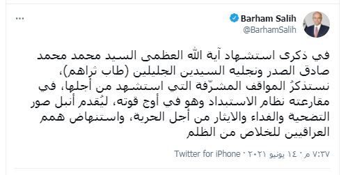 وقال صالح في تغريدة على تويتر ، إنه "في ذكرى استشهاد آية الله العظمى السيد محمد محمد صادق الصدر ونجليه السيدين الجليلين (طاب ثراهم)، نستذكرُ المواقف المشرّفة التي استشهد من أجلها، في مقارعته نظام الاستبداد وهو في أوج قوته".