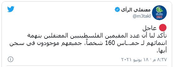 وقال حساب "معتقلي الرأي" في تغريدة على "تويتر": "تأكد لنا أن عدد المقيمين الفلسطينيين المعتقلين بتهمة انتمائهم لحماس 160 شخصا".