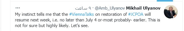وكتب أوليانوف في تغريدة على تويتر صباح اليوم (الجمعة) "مشاعري توحي الي أن محادثات فيينا لإحياء الاتفاق النووي ستستأنف الأسبوع المقبل ، على سبيل المثال ، لن تتأخر عن الرابع من يوليو أو من الممكن جدا ان يكون قبل ذلك ".
