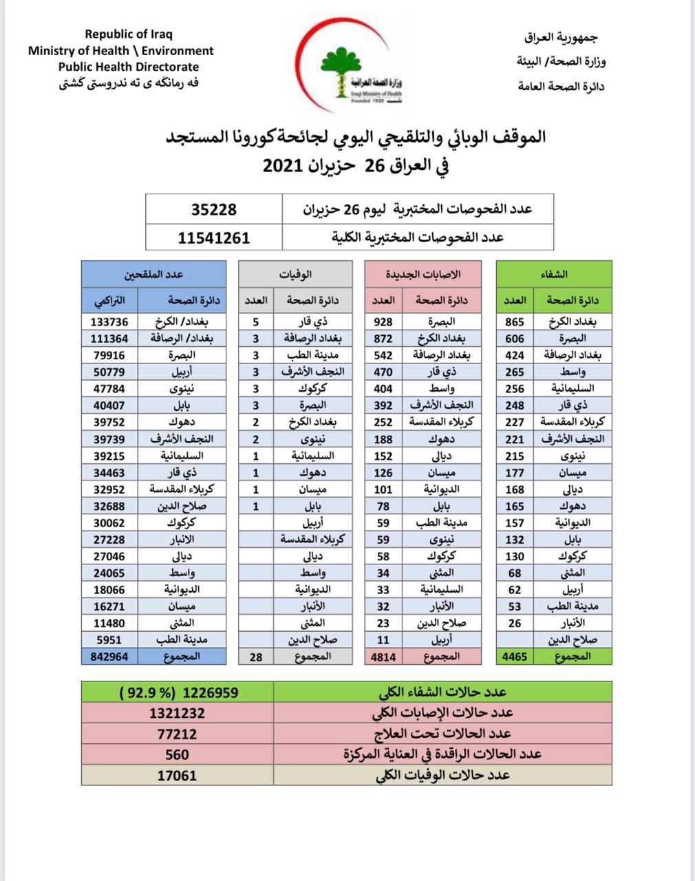 وقالت الوزارة في بيان، إن "كوادرها سجلت 4814 حالة إصابة جديدة، مقابل تماثل 4465 حالة للشفاء، وتسجيل 28 حالة وفاة بالفيروس".