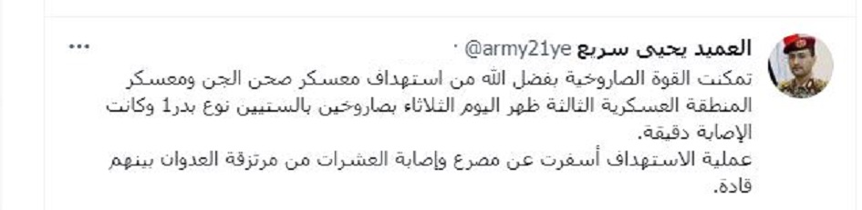 وقال العميد سريع في تغريدة له، " تمكنت القوة الصاروخية بفضل الله من استهداف معسكر صحن الجن ومعسكر المنطقة العسكرية الثالثة ظهر اليوم الثلاثاء بصاروخين بالستيين نوع بدر1 وكانت الإصابة دقيقة".