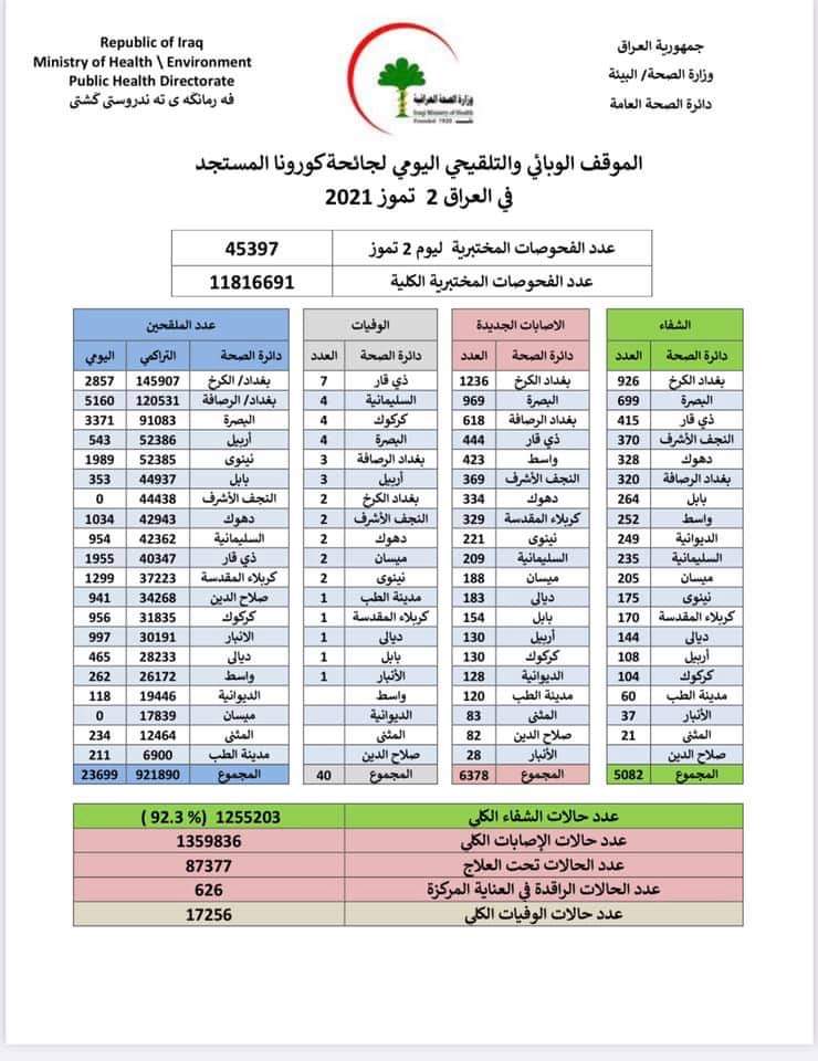 وقالت الوزارة في بيان، (2 تموز 2021)، إن "الكوادر الصحية سجلت في عموم المحافظات العراقية 6378 إصابة جديدة بفيروس كورونا، فيما تماثل 5082 مصاباً إلى الشفاء، وقابل ذلك وفاة 40 مصاباً خلال المدة المذكورة".