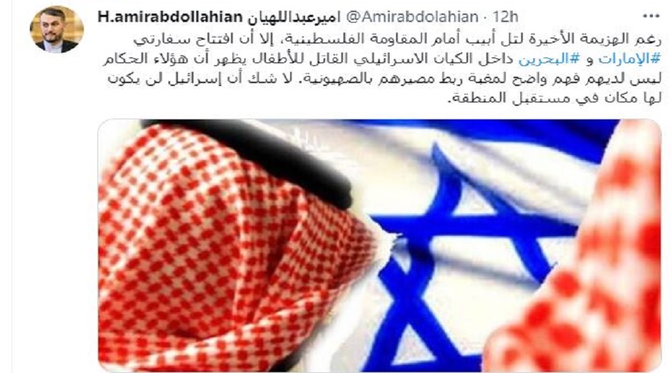 وکتب امیر عبداللهیان الیوم السبت في تغريدة له على "تويتر"، رغم الهزیمة الاخیرة لتل ابیب امام المقاومة الفلسطینیة الا أن افتتاح سفارتي الامارات والبحرین داخل الکیان الاسرائیلي القاتل للاطفال یظهر أن هولاء الحکام لیس لدیهم فهم واضح لمغبة ربط مصیرهم بالصهیونیة.