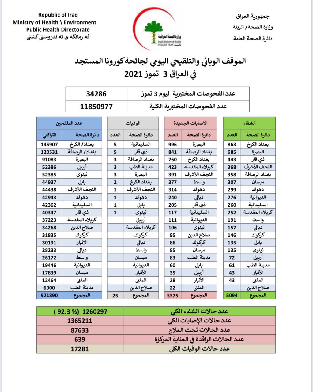 وقالت الوزارة في بيان، إن "كوادرها سجلت 5375 إصابة جديدة، مقابل تماثل 5094 حالة للشفاء، وتسجيل 25 حالة وفاة جديدة بكورونا في عموم البلاد".