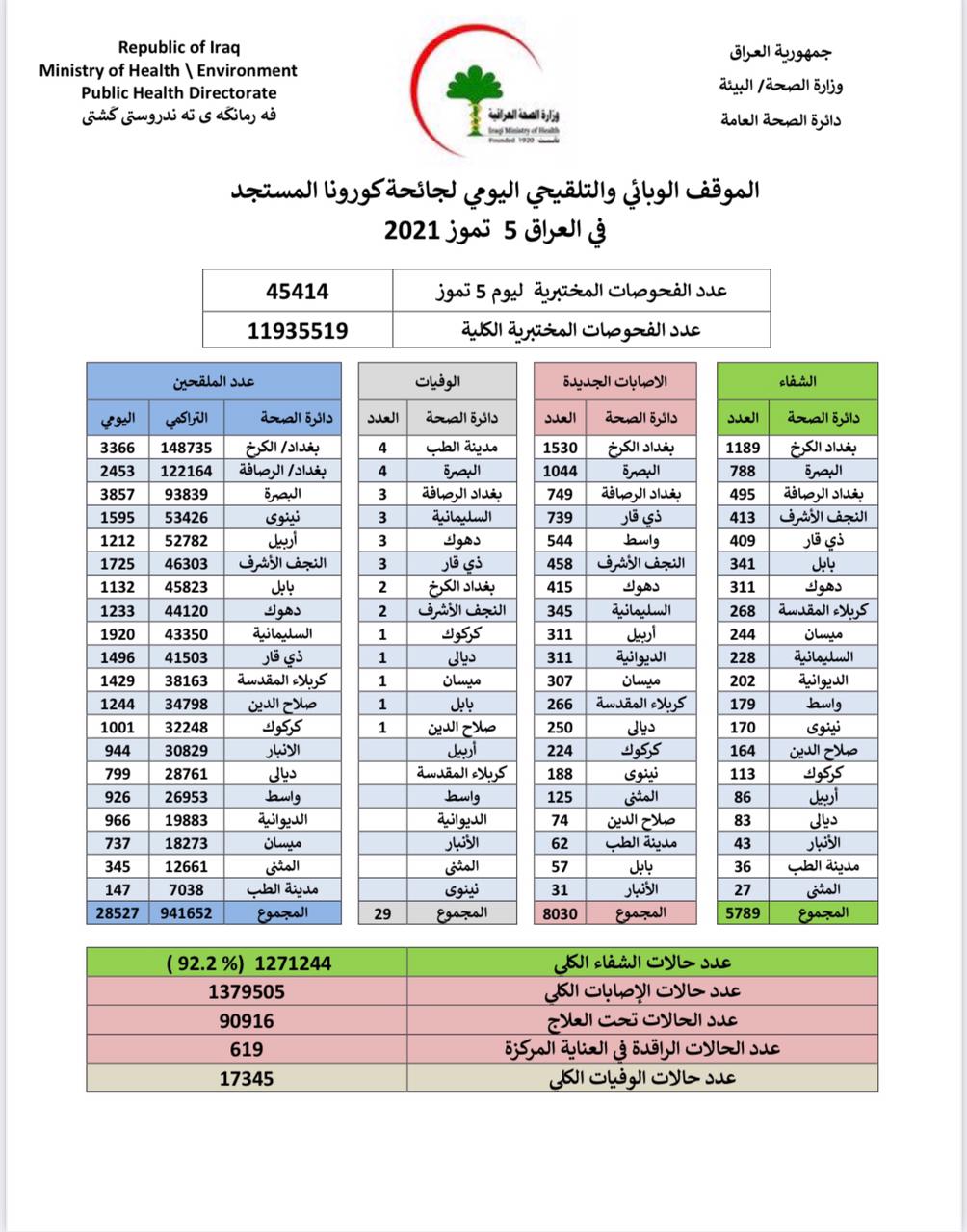 وأضاف البيان، أن "حالات الوفاة الجديدة بكورونا بلغت 29 حالة في عموم محافظات البلاد"،