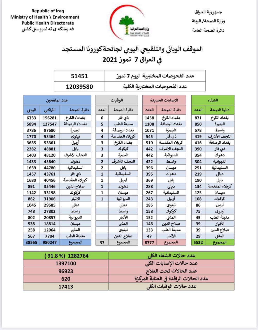 وقالت الوزارة في بيان، إن "كوادرها سجلت 8777 حالة إصابة، و 5522 حالة شفاء، و37 وفاة بالفيروس". وأشارت إلى تلقي 38565 شخصًا للقاح كورونا خلال يوم واحد.