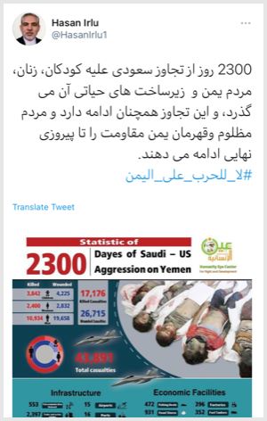 وفي تغريدة نشرها على صفحته الشخصية في تويتر ، اشار السفير الايراني في صنعاء الى مرور 2300 يوم على الحرب التي يشنها تحالف العدوان السعودي على اليمن، وقال: مر 2300 يوم على عدوان السعودية على الأطفال والنساء والشعب اليمني وبنيته التحتية الحيوية، وهذا العدوان مستمر ، والشعب اليمني المظلوم والبطل سيواصل المقاومة حتى النصر النهائي.