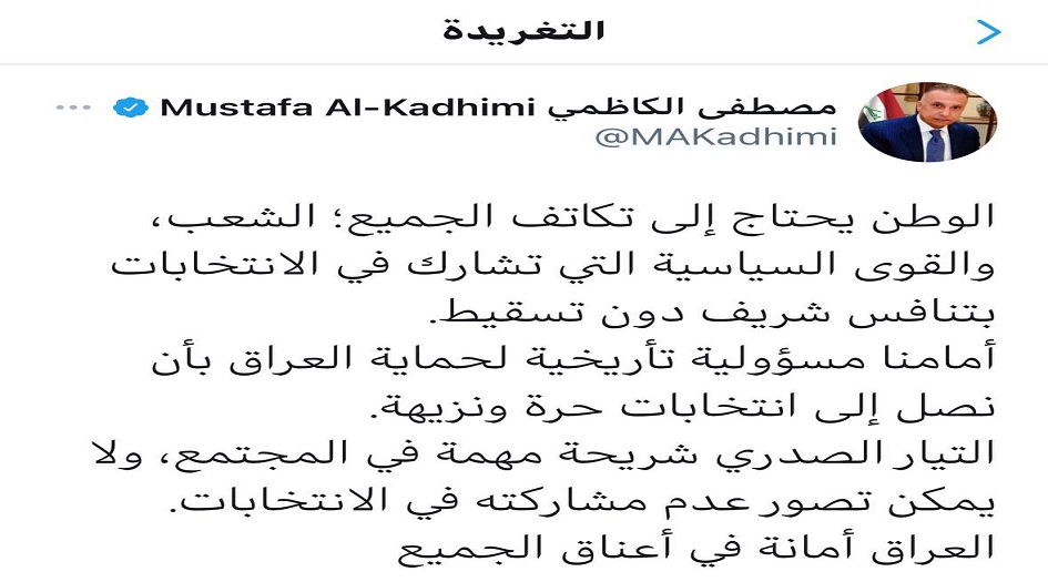 وذكر الكاظمي في تغريدة على تويتر،امس الخميس ان "الوطن يحتاج إلى تكاتف الجميع؛ الشعب، والقوى السياسية التي تشارك في الانتخابات بتنافس شريف دون تسقيط".