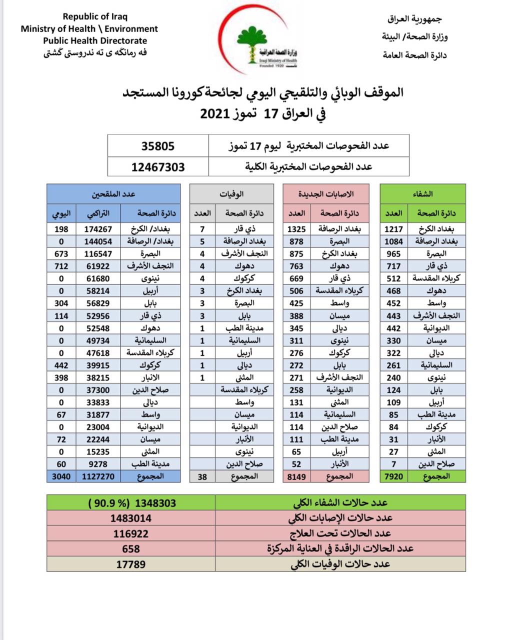 وقالت الوزارة في بيان إن "كوادرها سجلت 8149 إصابة جديدة، مقابل تماثل 7920 حالة للشفاء، بالإضافة إلى تسجيل 38 حالة وفاة بالفيروس". وأشارت إلى "تلقي 3040 شخصاً للقاح كورونا خلال يوم واحد".