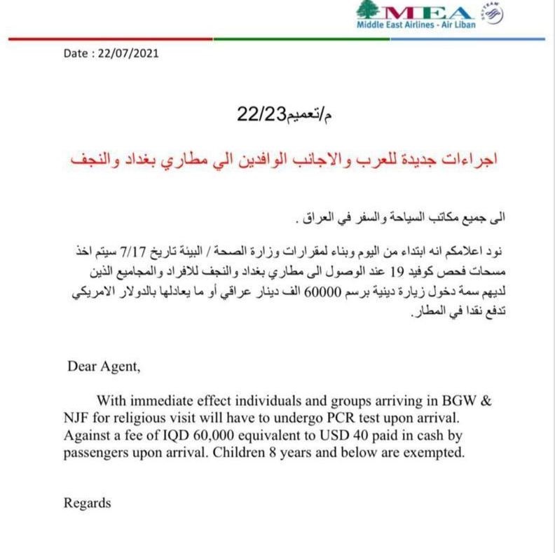 وبحسب وثيقة فإنه "فرض 60 ألف دينار رسوم للفحص الواحد أو ما يعادلها بالدولار وتدفع نقداً في المطار".