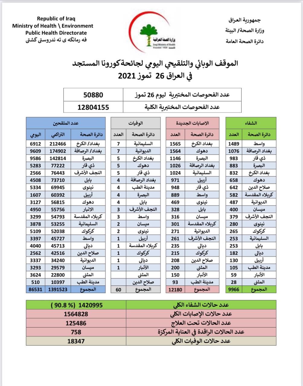 وقالت الوزارة في بيان، إن "كوادرها سجلت 12180 حالة إصابة جديدة بالوباء، مقابل تماثل 9966 حالة للشفاء، و 60 وفاة". وأشارت إلى "تلقي 86531 شخصاً للقاح كورونا في يوم واحد".