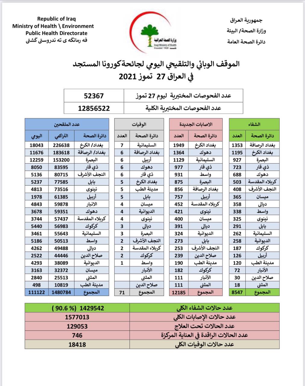 وقالت الوزارة في بيان، إن "كوادرها سجلت 12185 حالة إصابة جديدة، مقابل 8547 حالة شفاء، و 71 حالة وفاة بالفيروس". وأشارت إلى تلقي 111122 شخصاً للقاح كورونا في يوم واحد.