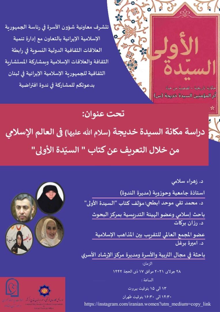 وتشارك في الندوة كل من الدكتورة زهرا سلامي الاستاذة الجامعية والحوزوية ومديرة الندوه ومحمد تقي موحد ابطحي مؤلف كتاب السيدة الاولى والباحث الإسلامي وعضو الهيئة التدريسية بمركز البحوث والدكتورة رزان بركات عضو المجمع العالمي للتقريب بين المذاهب الاسلامية والدكتورة اميرة برغل الباحثة في مجال التربية والاسرة مدير مركز الارشاد الاسري.