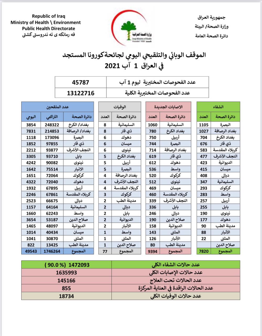 وقالت الوزارة في بيان، إن "كوادرها سجلت 9394 حالة إصابة جديدة، مقابل تماثل 7820 حالة شفاء، و 77 وفاة بالفيروس".