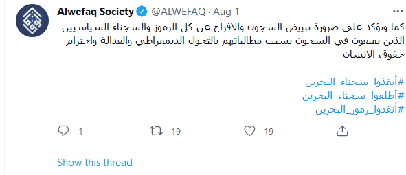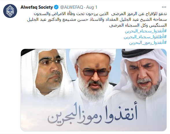 وقالت (الوفاق) "ندعو للإفراج عن الرموز المرضى الذين يرزحون تحت وطأة الأمراض والسجون، سماحة الشيخ عبد الجليل المقداد، والاستاذ حسن مشيمع، والدكتور عبد الجليل السنكيس، وكل السجناء المرضى".