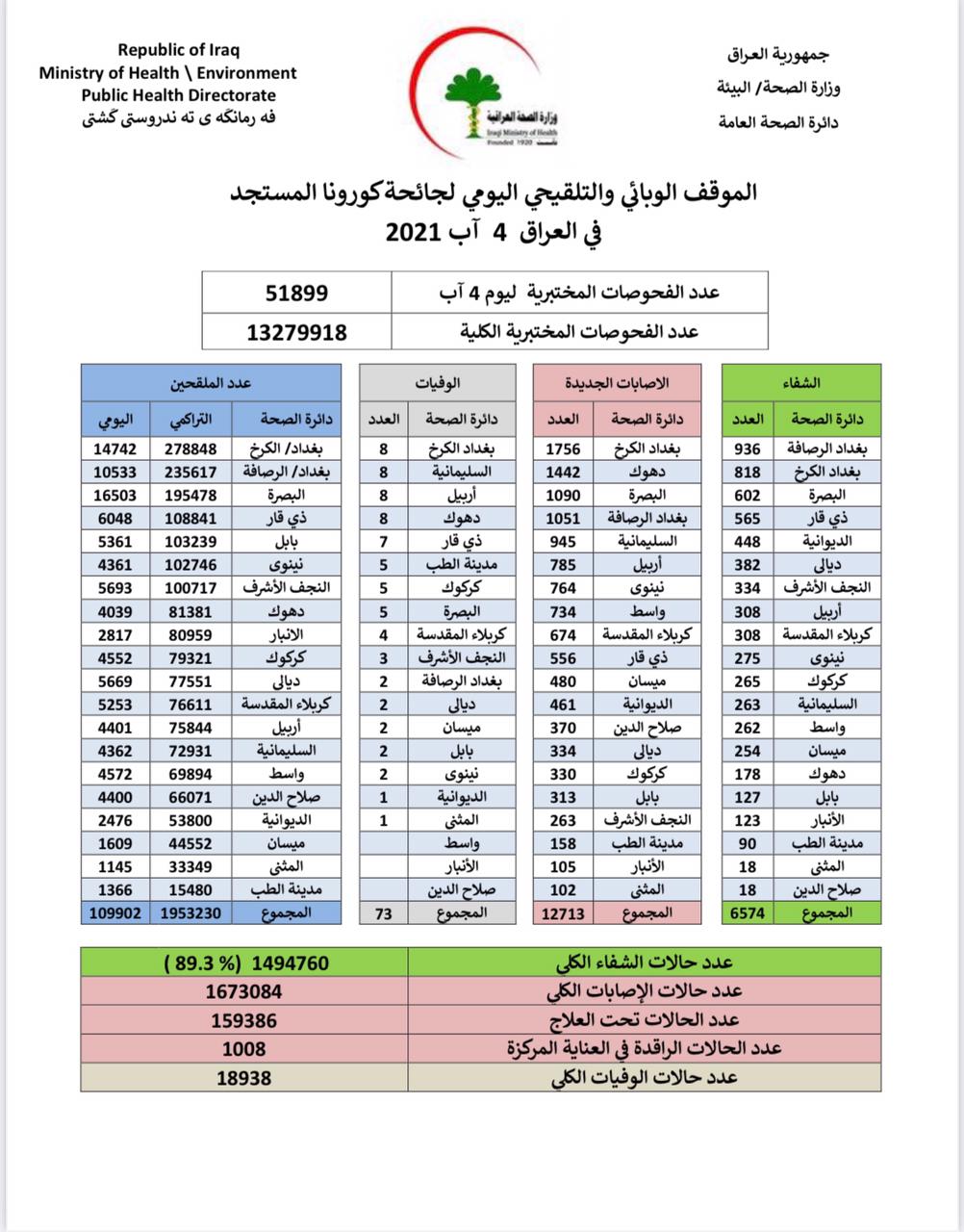 وقالت الوزارة في بيان، إن "كوادرها سجلت 12713 حالة إصابة، مقابل تماثل 6574 حالة شفاء، و 73 وفاة بالفيروس". وأشارت إلى تلقي 109902 شخصاً للقاح كورونا في عموم البلاد خلال يوم واحد.