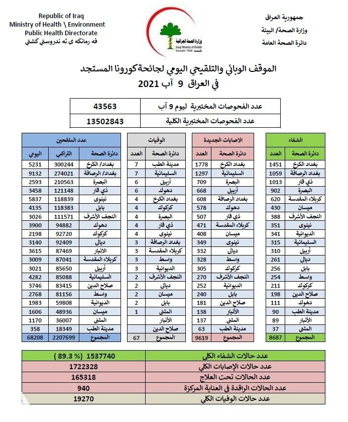 وقالت الوزارة في بيان، إنها "سجلت 9619 إصابة جديدة، مقابل تماثل 8687 حالة للشفاء، و67 حالة وفاة بالفيروس". وأشارت إلى "تلقي 68208 أشخاص للقاح كورونا في يوم واحد".