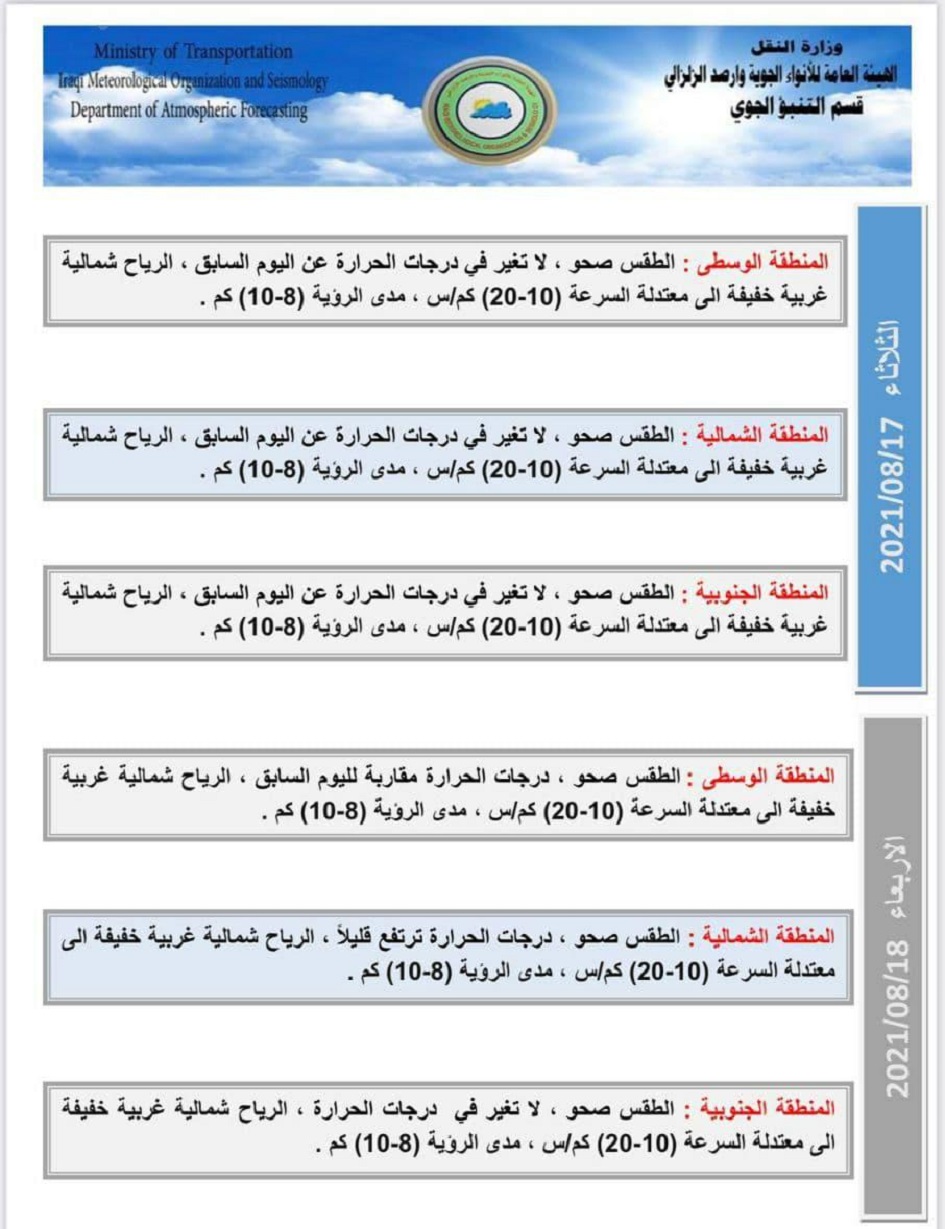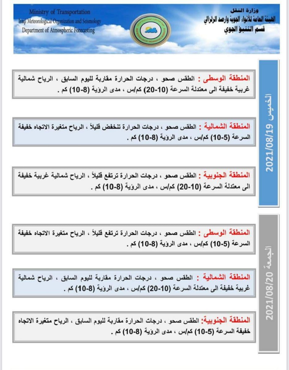 وبحسب بيان فان طقس اليومين المقبلين سيكون صحواً في عموم مناطق البلاد ودرجات الحرارة العظمى تتراوح بين 40 الى 46 مْ في المحافظات. وأشار الى ان طقس الخميس "10 محرم" والجمعة سيكون أيضاً صحواً مع ارتفاع بدرجات الحرارة.