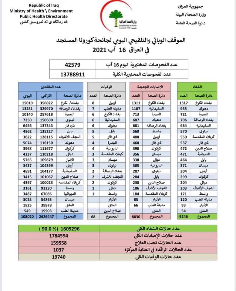 وقالت الوزارة في بيان ، انها سجلت 8830 اصابة جديدة فيما تماثل للشفاء9246 شخصا وسجلت 68 حالة وفاة". واضافت انه تم تلقي 108020 شخصا للقاحات كورونا من خلال مراكز التطعيم المنتشرة في عموم العراق.