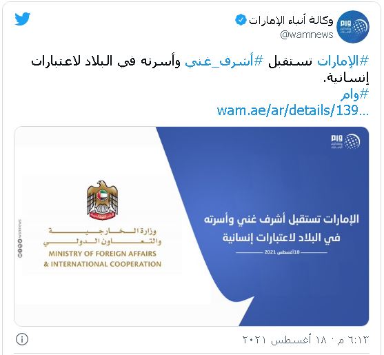 ونقلت وكالة الأنباء الأمارات عن الوزارة أن "دولة الإمارات استقبلت الرئيس أشرف غني وأسرته في البلاد وذلك لاعتبارات إنسانية".