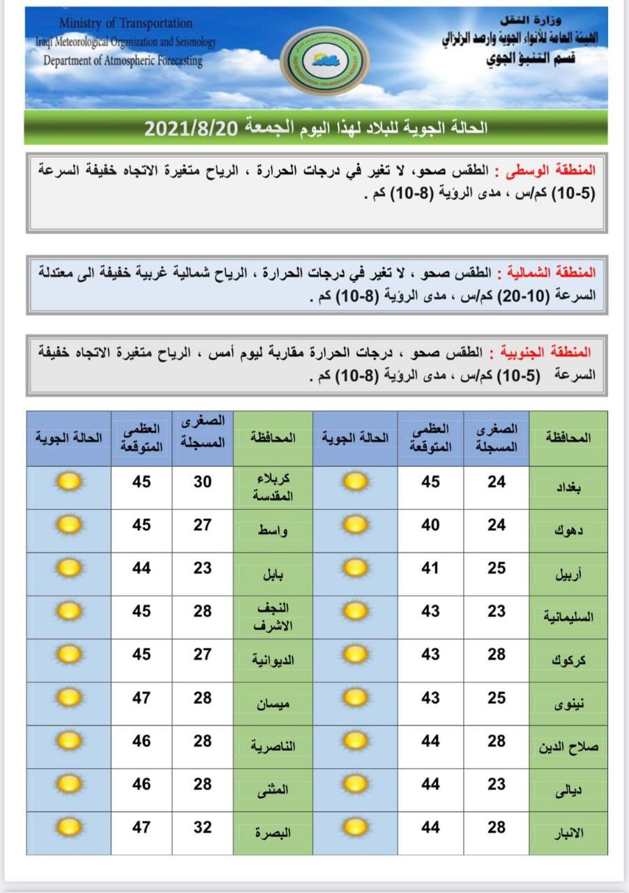 حالة الطقس المتوقعة في العراق لليوم الجمعة